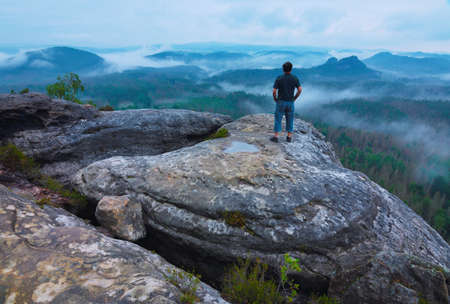 Man enjoy view at Foggy morning in Saxon Switzerland. Saxony region, Germany