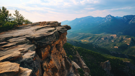 Close-up of textured cliff stone with panoramic mountain views in the background and soft sunlight casting shadows