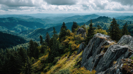 Experience a breathtaking mountain view with lush forests, rolling hills, and dramatic clouds. Discover the serene beauty of nature in a remote landscape.