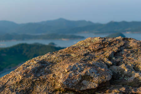 A stack of round stones standing on the shore of a sea Rocky coast at Khao Laem Ya Mu Ko Samet National Park Rayong, Thailand in sunset time