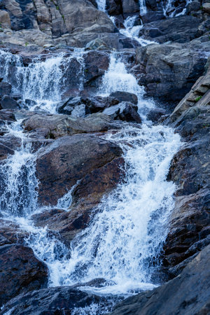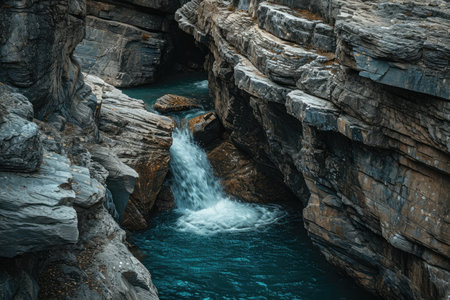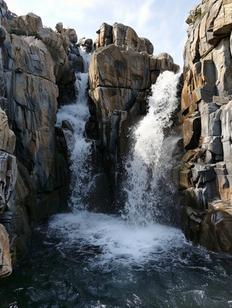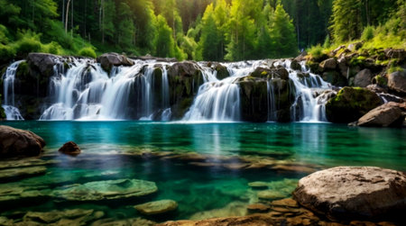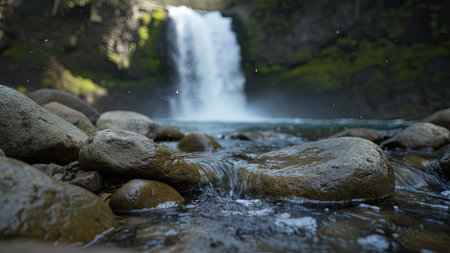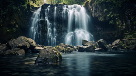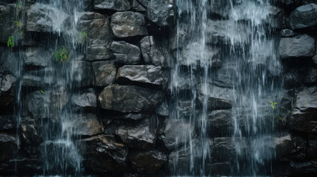 Majestic and rugged cliff waterfall in a pristine natural environment with wild water cascading over textured rocks. Creating a refreshing and pure stream