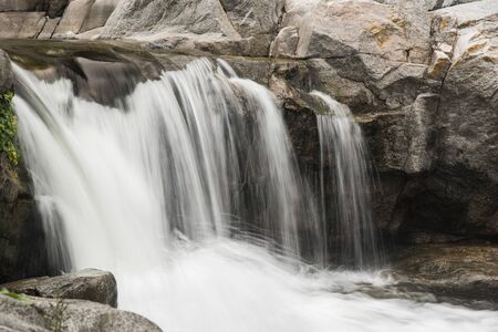 Long exposure of a waterfall flowing over rocks in a mountain stream.