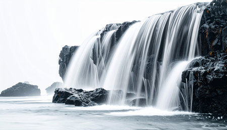 Water cascades in a smooth, silky veil over dark, rugged cliffs, a timeless display of natures power and tranquility. This long-exposure photograph captures the serene and majestic flow, creating a minimalist and calming scene perfect for contemplation.