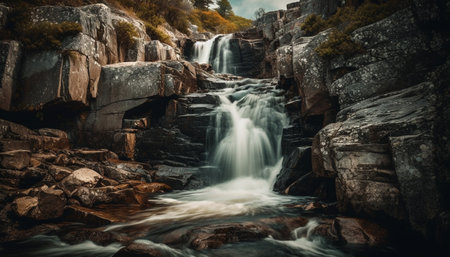 AI Generated. Water cascading down rocky cliffs creating a silky smooth waterfall