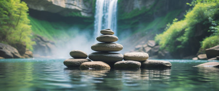 AI Generated. Stacked Stones in Calm Water by a Picturesque Waterfall in Nature