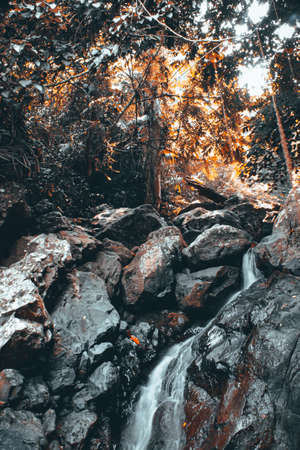 Beautiful waterfall in the mountains with the rays of the sun shining through the trees