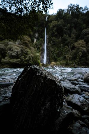 Superb image of a close up of a rock with the Thunder Creek Falls in the background at the Haast Pass taken on a cloudy day, New Zealand