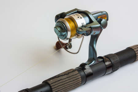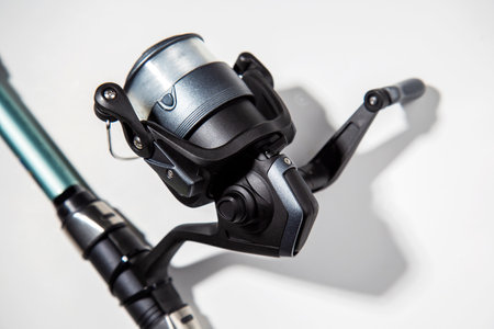Fishing reel for rod close up on a white background isolated. selective focus, copy space