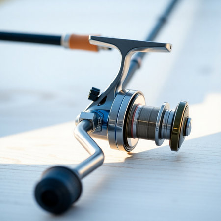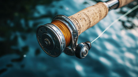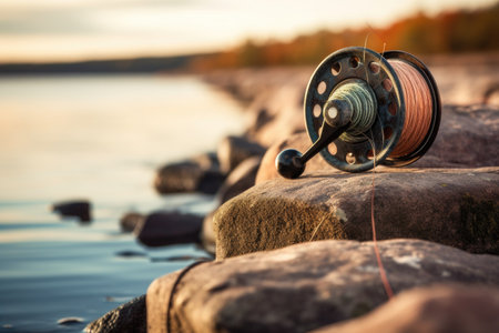 close-up of a fishing reel and line near the lakeshore, created with generative ai