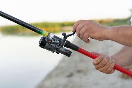 Fishing rod in male hands close-up. The guy fisherman twists the line and pulls the fish. River or estuary. Modern fishing tackle. Place for text