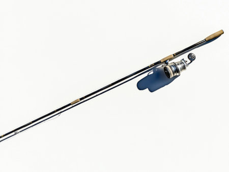 fishing rod and reel are displayed against a clean white backdrop. The focus is on the intricate details of the reel and fishing line illuminated by bright lighting.