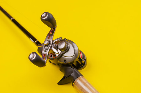 Fishing rod and reel on a yellow background. Casting rod with a multiplier reel. Fishing tackle. Selective focus.