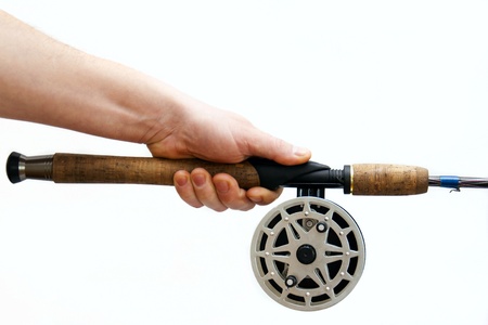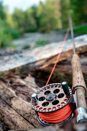 Man fly fishing with reel and rod. Sport fly fisher man close up on reel.