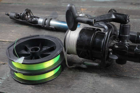 Fishing concept. Fishing spinning rod and reels with lines on wooden background with free space