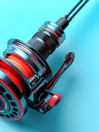 High Resolution Image of Modern Fishing Reel Equipment on Blue Background, Angling Gear Close Up AI Generative