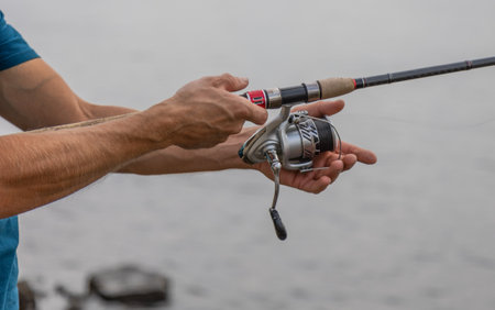 Fishing on the lake. Hands of a fisherman and spinning close-up. Fishing background