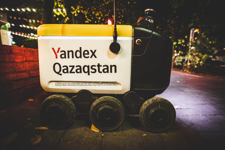 Profile shot of a modern autonomous delivery robot on a city sidewalk at night. Almaty, Kazakhstan - October 04, 2024