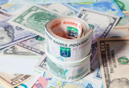 A bundle of Russian paper money in denominations of 1 and 5 thousand rubles, rolled up, lies over USA and European paper money - USD, EUR.