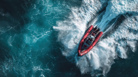 A thrilling aerial shot of a high-speed rescue boat cutting through turbulent ocean waves, showcasing the power and excitement of marine adventures on a bright day.