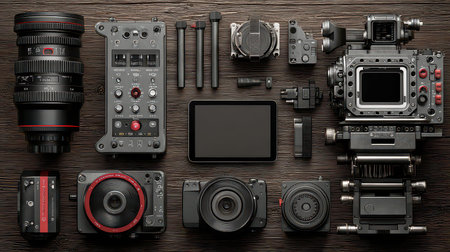 A detailed arrangement of professional camera gear and accessories on a rustic wooden surface, highlighting tools essential for photography and videography.