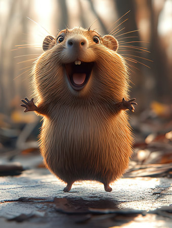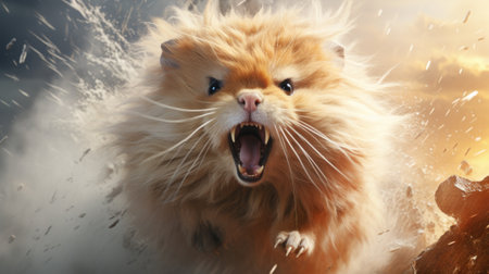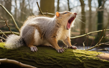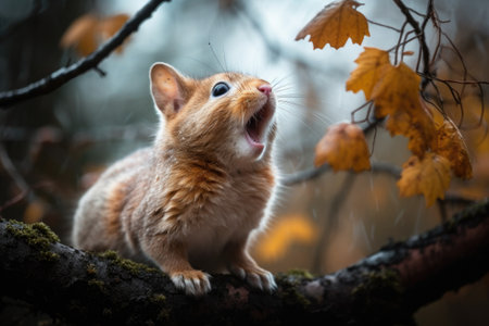 a rodent peeks out from a branch, mouth wide open, in a cinema4d rendered style. this artwork by serge marshennikov captures joyful chaos with a touch of motion blur. the strong facial expression of the rodent adds to the emotional impact of the image. ai generated