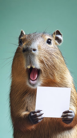Cute surprised capybara holding blank white invitation card, party concept. Copy space. Generative AI.