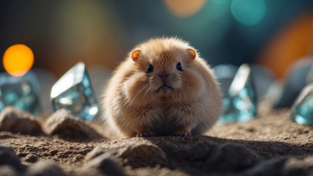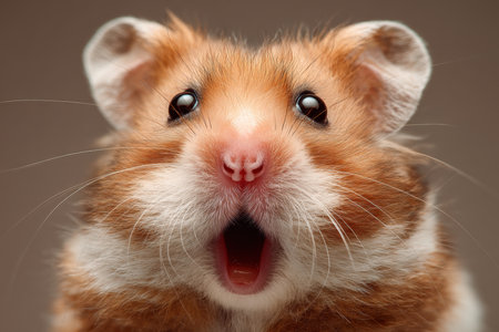 An adorable hamster with wide eyes and an open mouth, displaying a surprised expression. The hamster's soft fur is a mix of brown and white, with gentle lighting highlighting its features