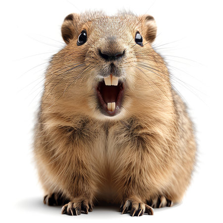 A groundhog stands in a clearing with his mouth open and screams. Groundhog Day prediction of warming and spring