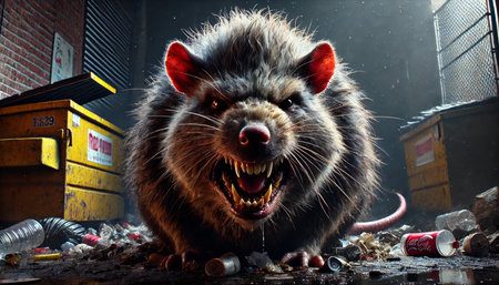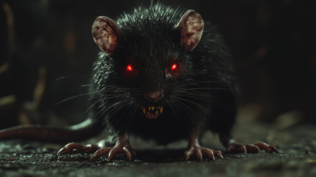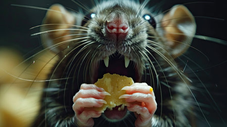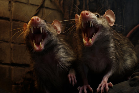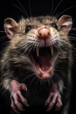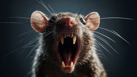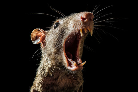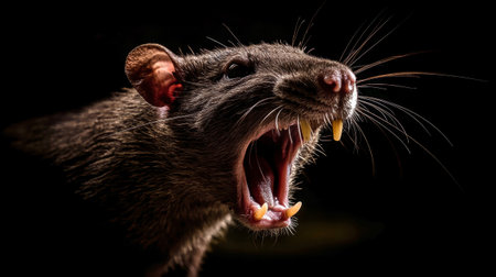 In a dramatic moment, a rat reveals its sharp fangs with an angry expression, set against a dark background that accentuates its detailed fur and lighting.