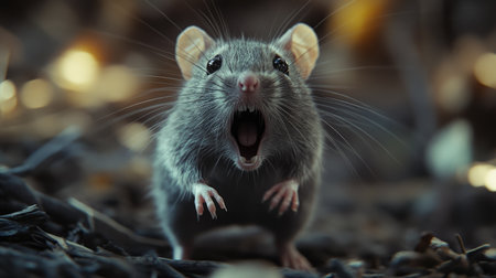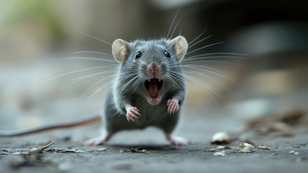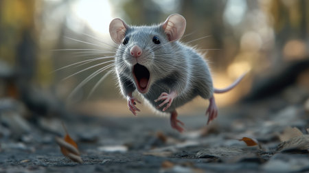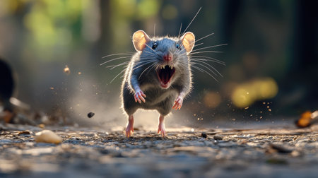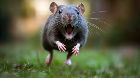 Terrified gray rat running away, mouth wide open as it screams in fear, conveying a sense of urgency and panic