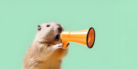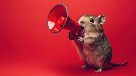 This delightful image features a small rodent energetically holding a megaphone against a striking red backdrop, exuding charm and playfulness, ideal for various creative uses.
