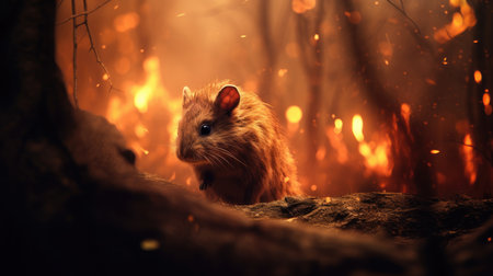 A small rodent sits on a rock amidst a raging forest fire, surrounded by flames, looking out calmly as the heat transforms the ground into deep red, seemingly unfazed by the chaos.