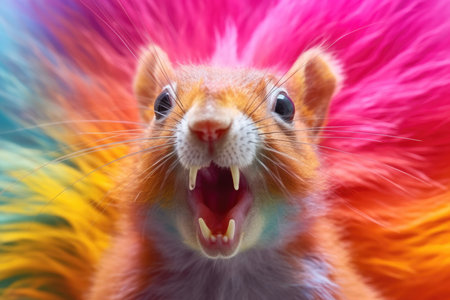 Close-up of surprised squirrel with wide eyes and open mouth against orange background