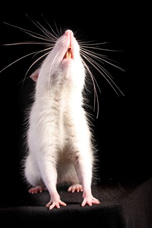 Young white rat looking up on black background