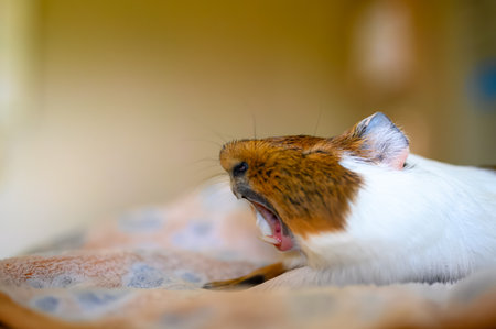 Side view of a tired Guinea pig laying on a blanket while stretching and yawning.