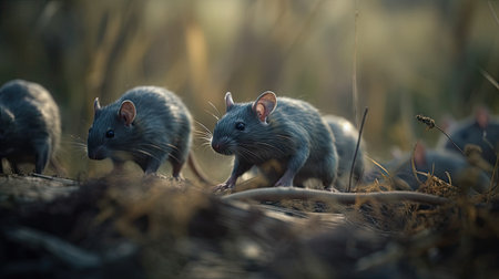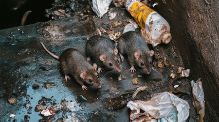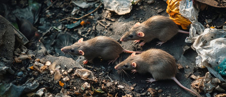 In an open slum, several rats scavenge among the piles of garbage, highlighting the struggles of urban life and waste issues. The cluttered ground is filled with debris.