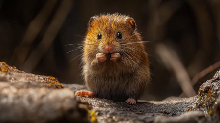 This captivating close-up showcases a small rodent with soft fur and striking eyes, sitting on natural terrain amidst a serene forest setting.