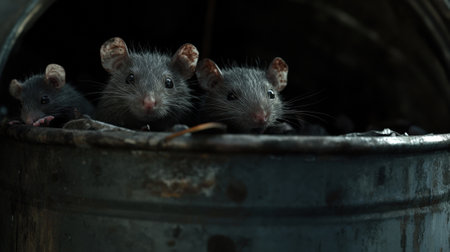 Dirty rats peeking out from garbage bin. High quality photo