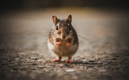 Close up of a small brown mouse on the ground in the park