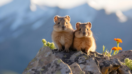 Family of Pikas on Mountain Boulder at Dawn