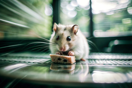 Hamster eating a piece of bread on a glass table. Selective focus.