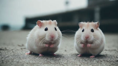 Closeup of two small funny miniature jungar hamsters sitting on a floor. Fluffy and cute Dzhungar rats at home.