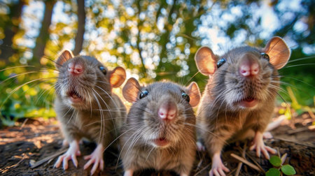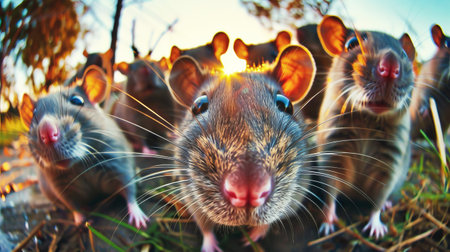 Rats racing on a track, motion blur, competitive atmosphere, sunny day, playful yet intense, closeup perspective