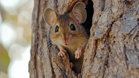 This captivating image features a small mouse peeking out from a tree hollow, showcasing its big ears and bright eyes. It highlights the beauty and charm of woodland wildlife.