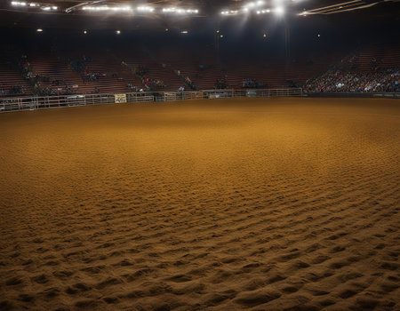 Rustic wooden fence and dirt floor creating a classic rodeo atmosphere under stadium lighting