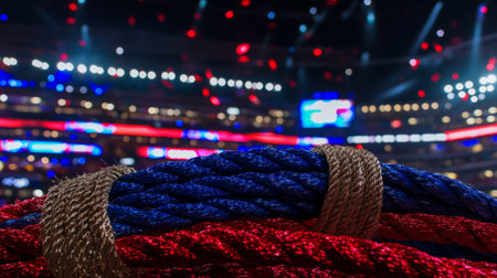 Vibrant blue red and gold ropes are positioned in a ring glimmering under the arena lights ready for the upcoming action packed event.
