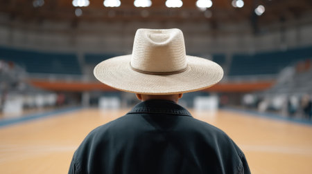 A person wearing a wide-brimmed hat stands in a sports arena, focused on the action in the background, capturing a moment of anticipation and excitement.