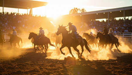 Rodeo Event at Sunset in a Packed Stadium With Cowboys and Horses