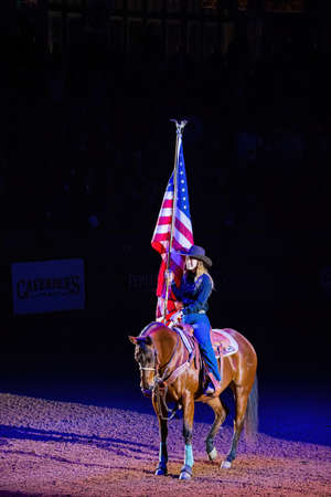 Fort Worth, NOV 27 2021, Cowgirl holding America flag in the Stockyards Championship Rodeo