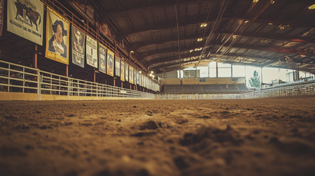 Dirt arena floor with banners in livestock exhibition hall during daylight